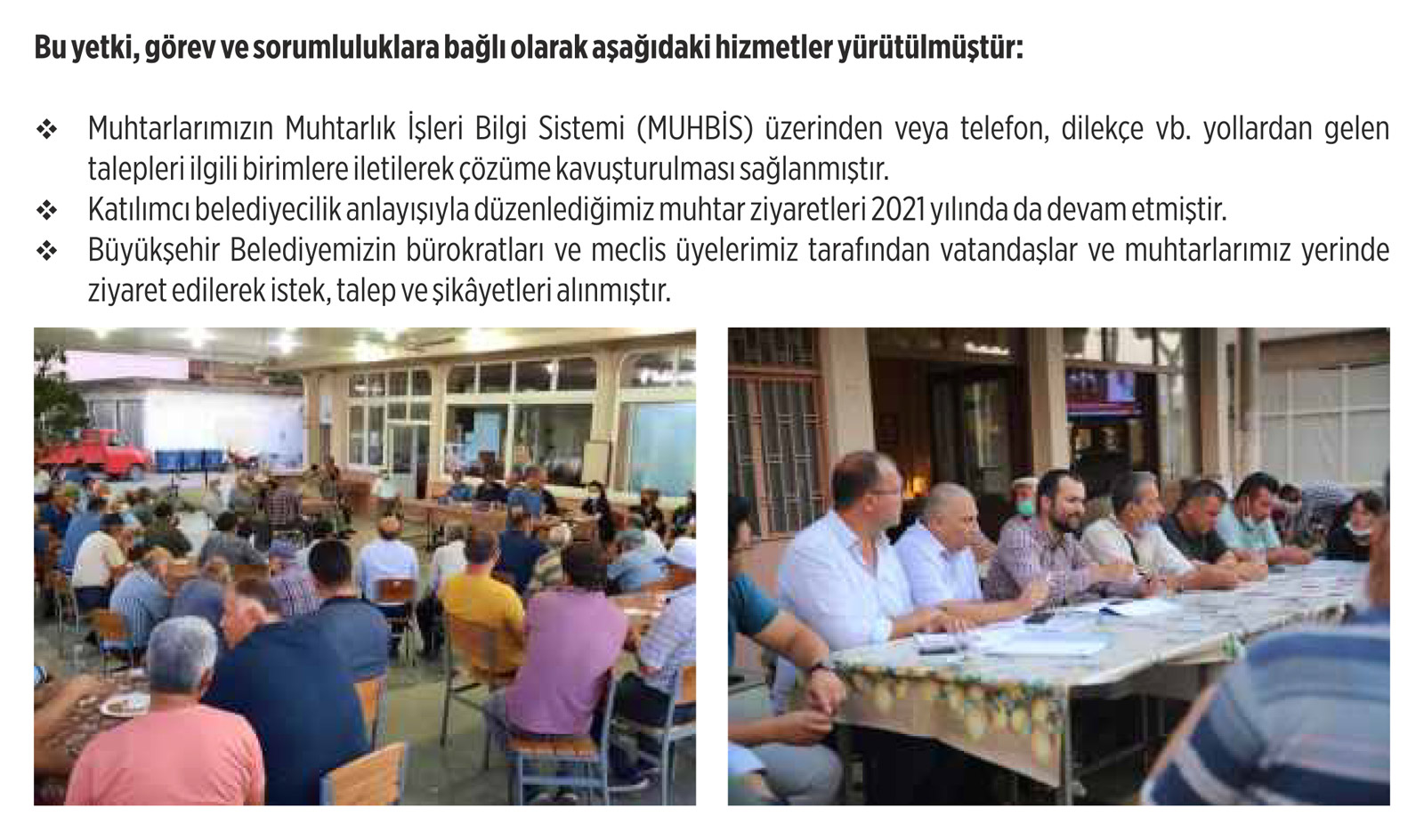 Belediye muhtarları düzenli aralıklarla ziyaret ederek, mahallelerin ihtiyaç, talep ve şikayetlerini öğreniyor ve bunlara yönelik çözümler geliştiriyor. Ayrıca belediye meclis üyeleri vatandaşlar ile düzenli olarak bir araya geliyor.
