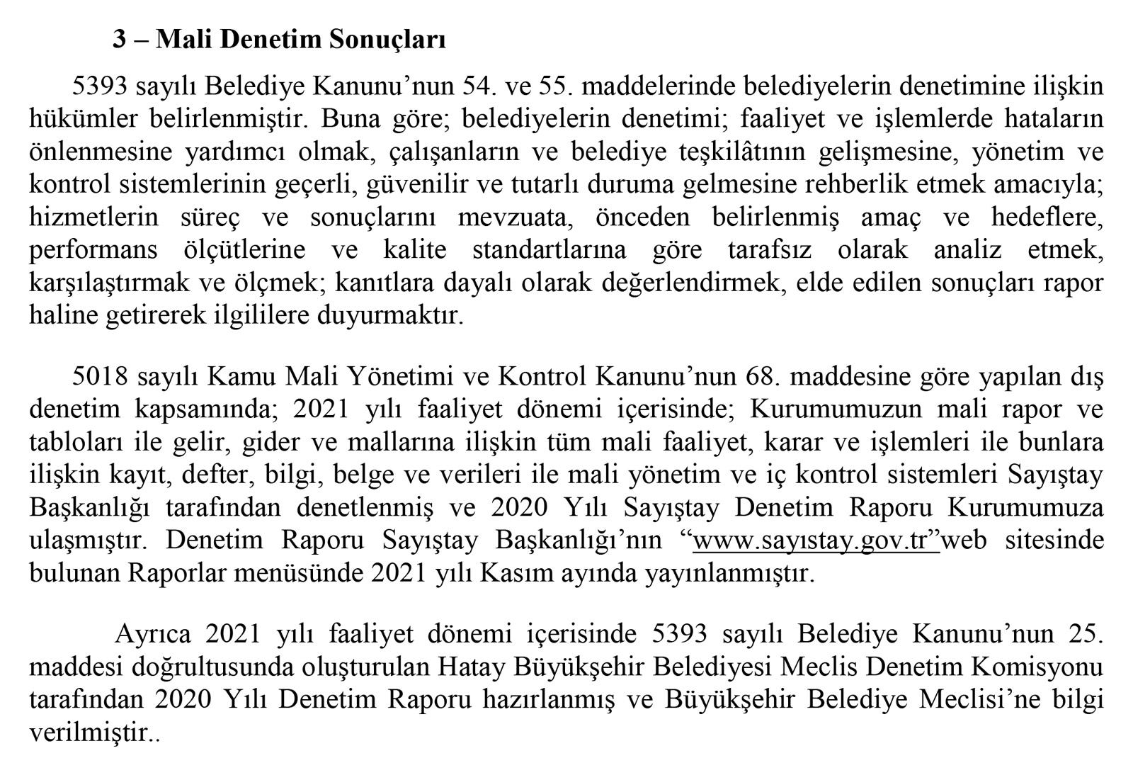 Belediyenin faaliyet raporunda mali denetim sonuçları bölümü var ve kuruma ait Sayıştay denetim raporu ile ilgili de kamuoyu ile bilgi paylaşılıyor.