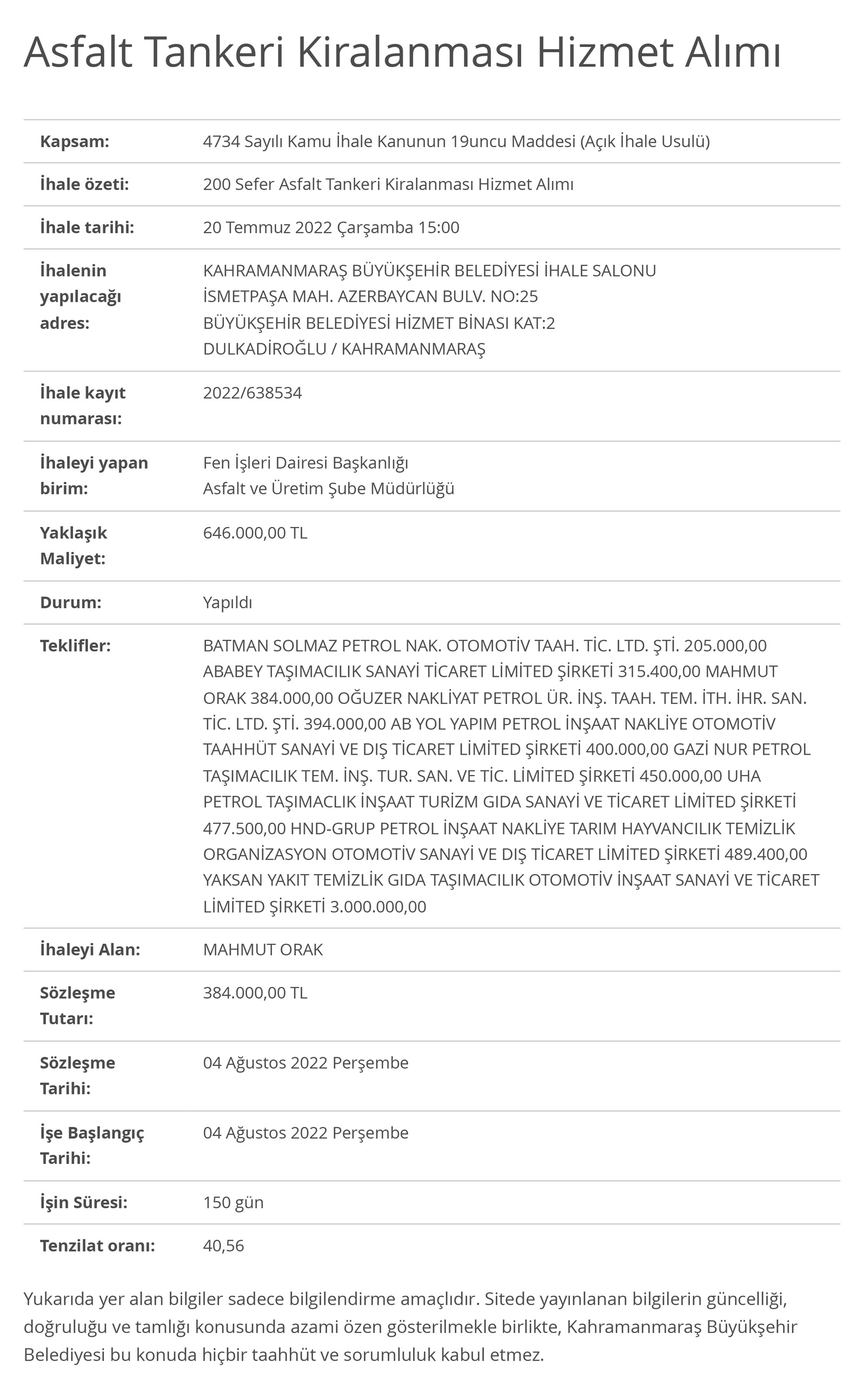 Belediye internet sitesinde tamamlanan ihaleler ile ilgili teklif verenler, ihaleyi alanlar ve sözleşme tutarı dahil olmak üzere kamuoyu ile bilgi paylaşıyor.