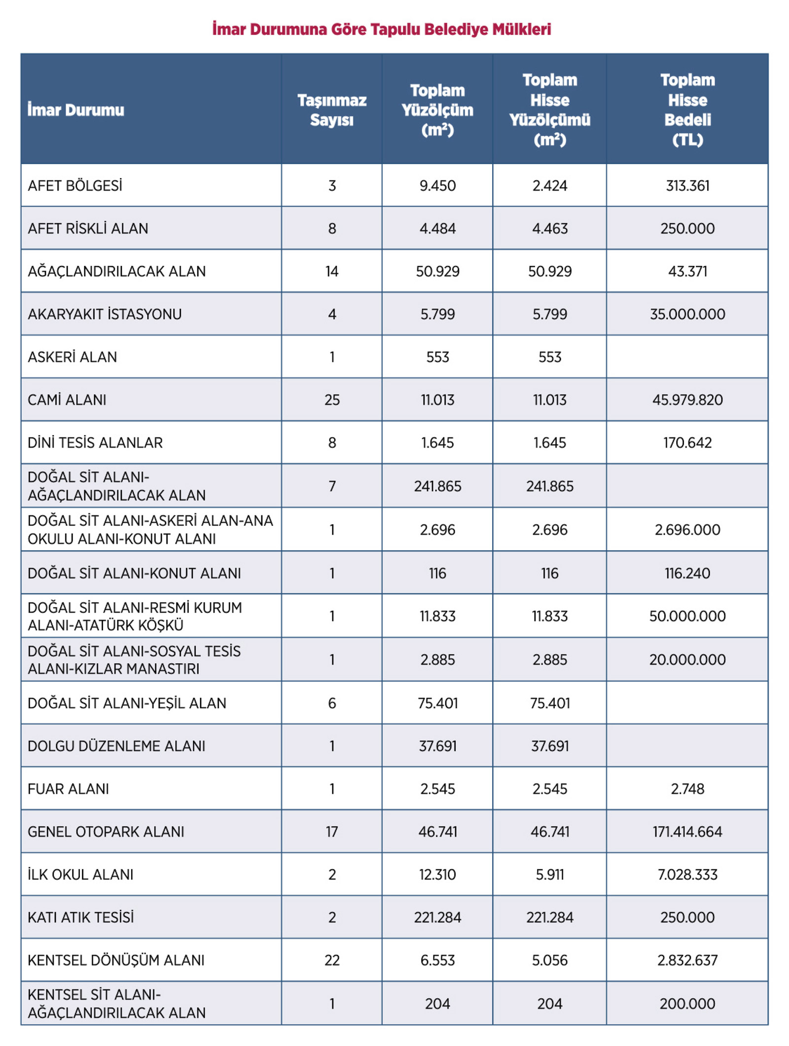Belediye elinde bulunan taşınmazların sayısını, ölçüsünü ve mali değerini kamuoyu ile paylaşıyor.